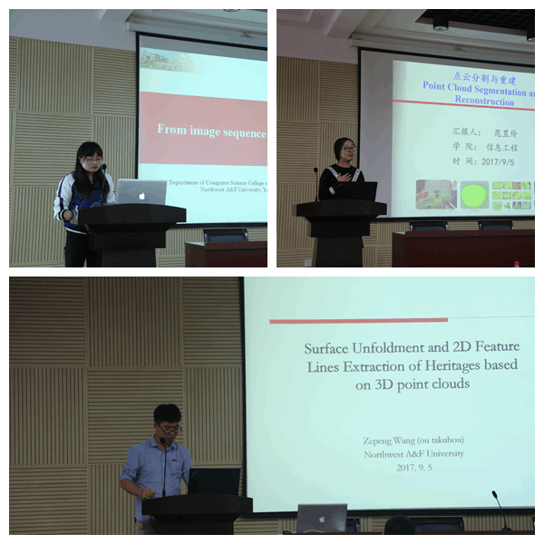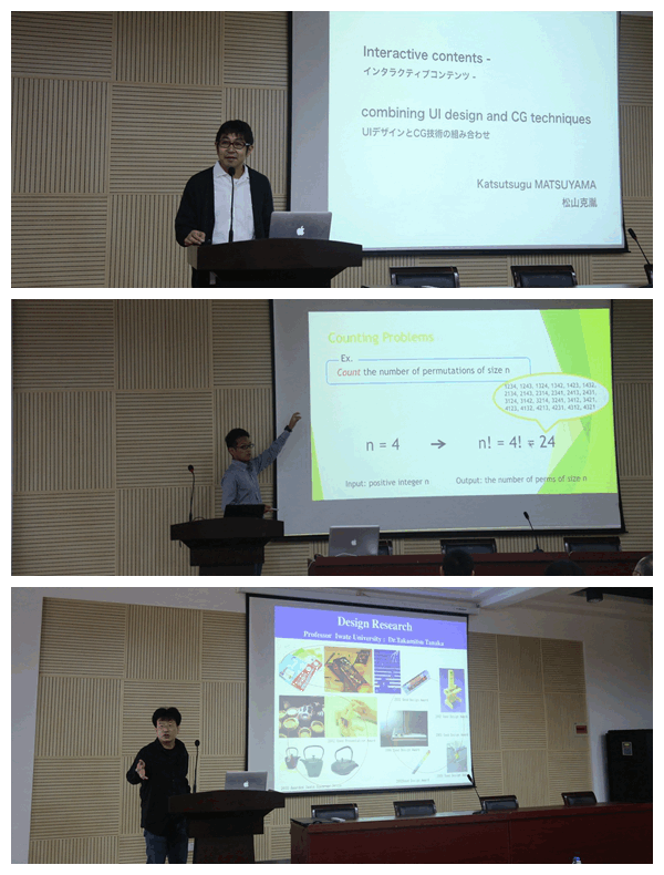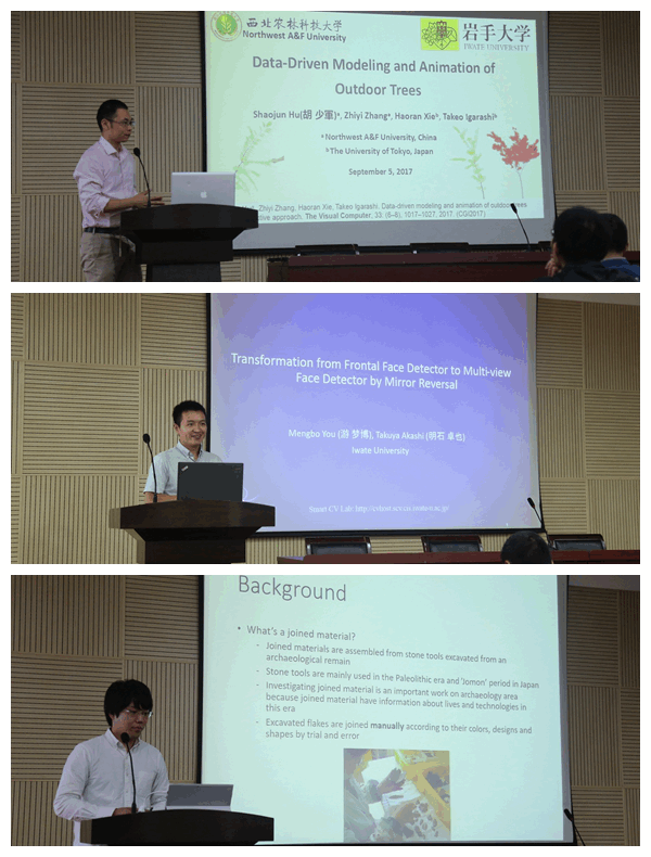 此次学术交流以“三维测量技术的合作研究研讨”为主题,开展了系列学术报告。今野教授为师生作了题为“Interactive Visualization of Assembly Instruction for Stone Tools Restoration”的学术报告。该报告详细介绍了一种将三维装配爆炸图应用到考古学研究的新方法,即采用基于点云的交互式可视化技术实现了石器工具的快速修复。田中隆充教授、川崎秀二教授、木村彰男教授、Enhkbayar教授分别作了“通过榫卯技术进行立方体拼图的创意开发”、“通过数据分析研究建立臭菘的恒温维持机制模型”、“混合方法的3D复杂雕像模型重建”、“脸部度量及其应用”的学术报告。同时,我院胡少军副教授、杨龙博士、王泽鹏博士与岩手大学青年教师松山助教、山中助教、卢忻助教分别进行了学术报告。报告的题目分别是:“Data-Driven Modeling and Animation of Outdoor Trees”、“Handheld 3D scanning with commodity depth cameras”、“Surface Unfoldment and 2D Feature Lines Extraction of Heritages based on 3D point clouds”、Interactive contents - combining UI design and CG techniques (互动内容 - 结合UI设计和CG技术)、Algorithms for Enumerating Discrete Objects(枚举离散对象的算法)、Face Parts Measurement and Its Application(脸部度量及其应用)。两校研究生也汇报了近期的研究成果,受到双方教授的积极评价。