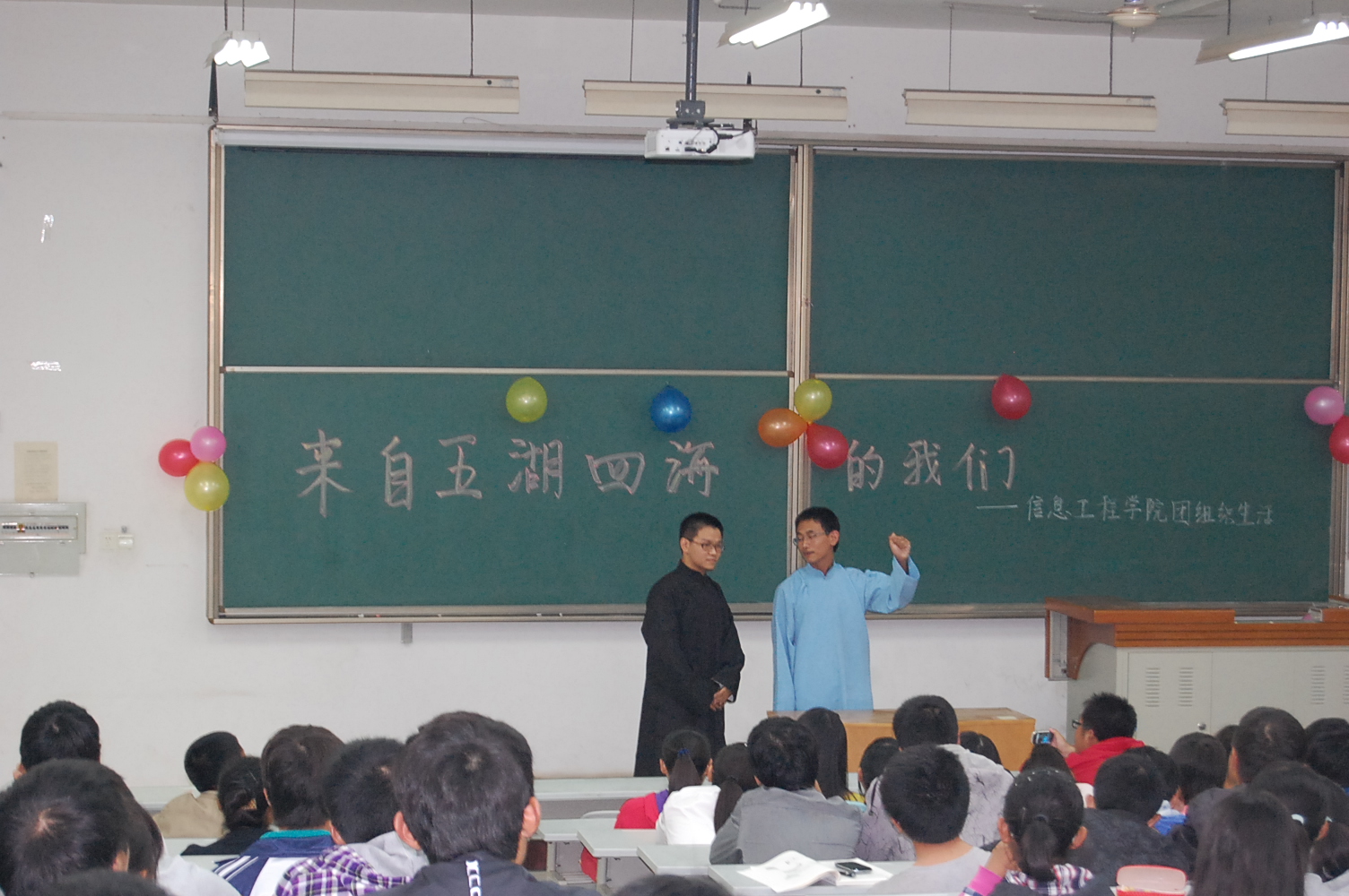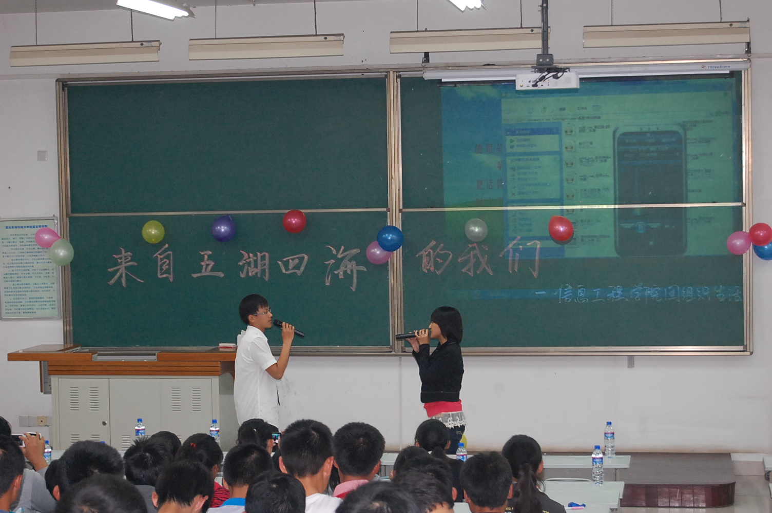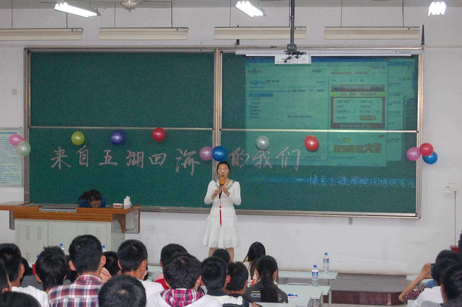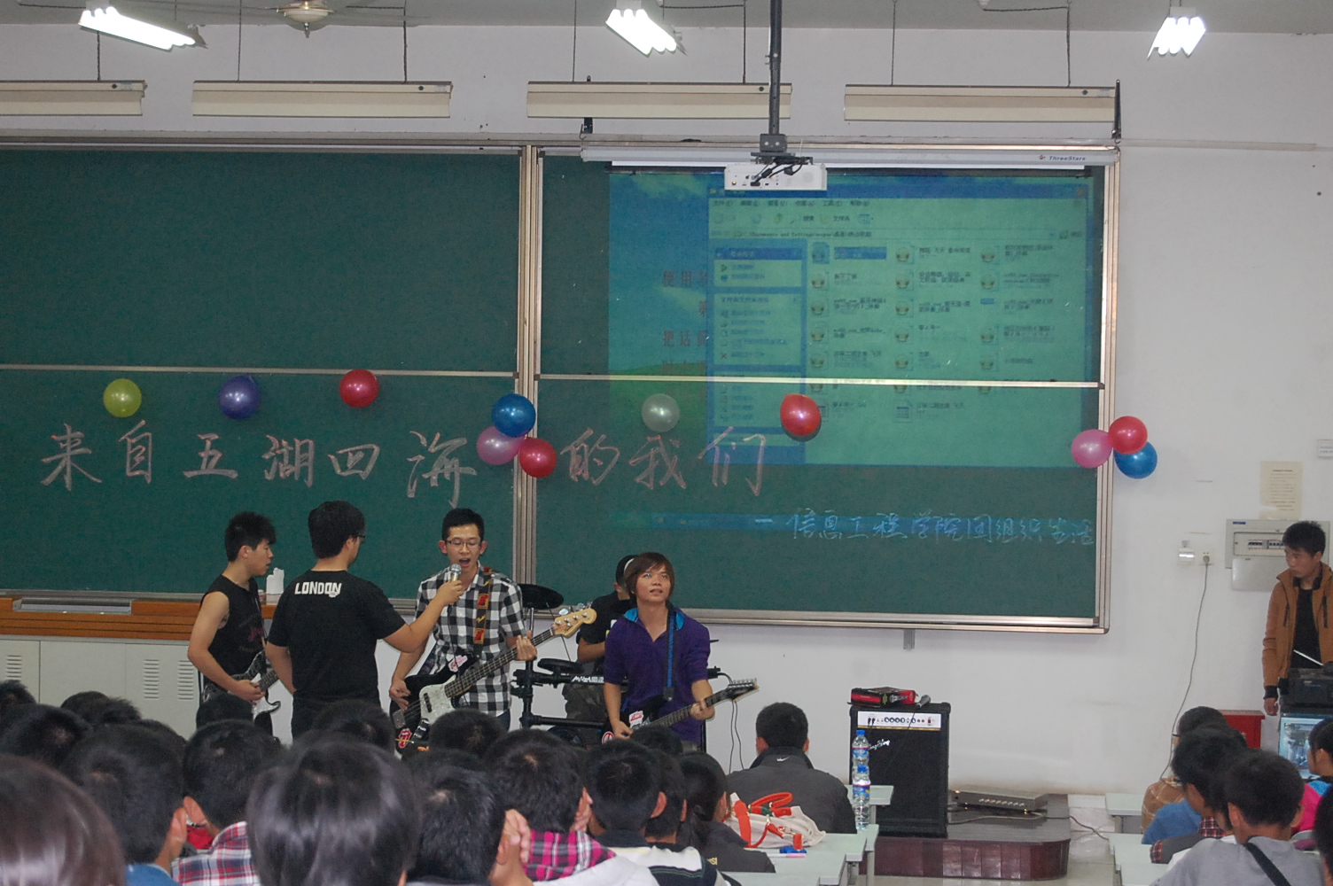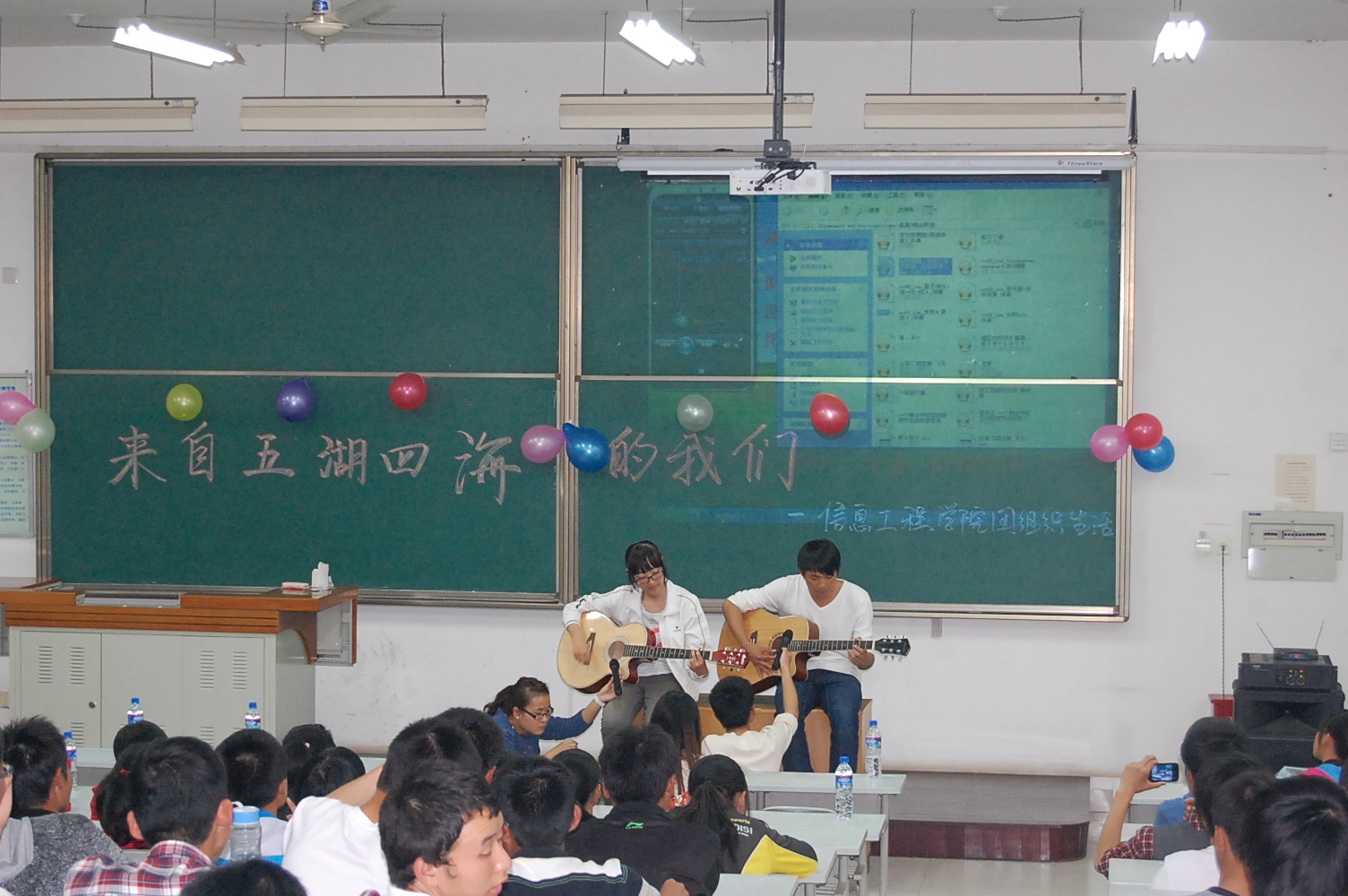9月25日晚7点半,信息成人影视片 在8T阶梯教室举行了2012级新生迎新晚会。团工委书记桂恺、辅导员倪玲、仵亚伟、郭峰来到活动现场观看晚会。