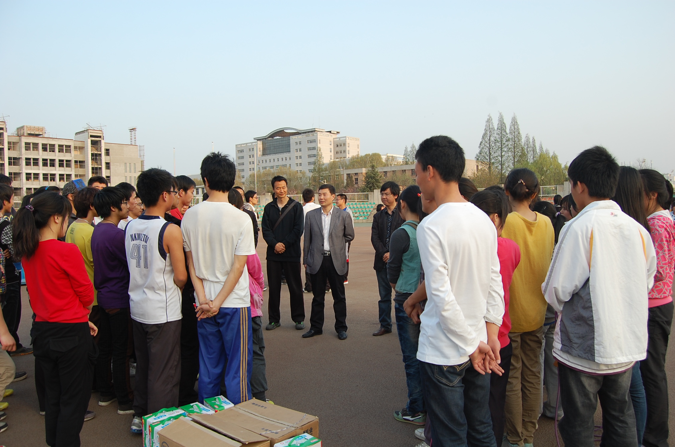 4月9日下午6:00,我院党委副书记何卫军携带营养品赴田径场慰问了积极备战校运会的运动员们。成人影视片 辅导员谷申杰老师和倪玲老师陪同参加了此次活动。